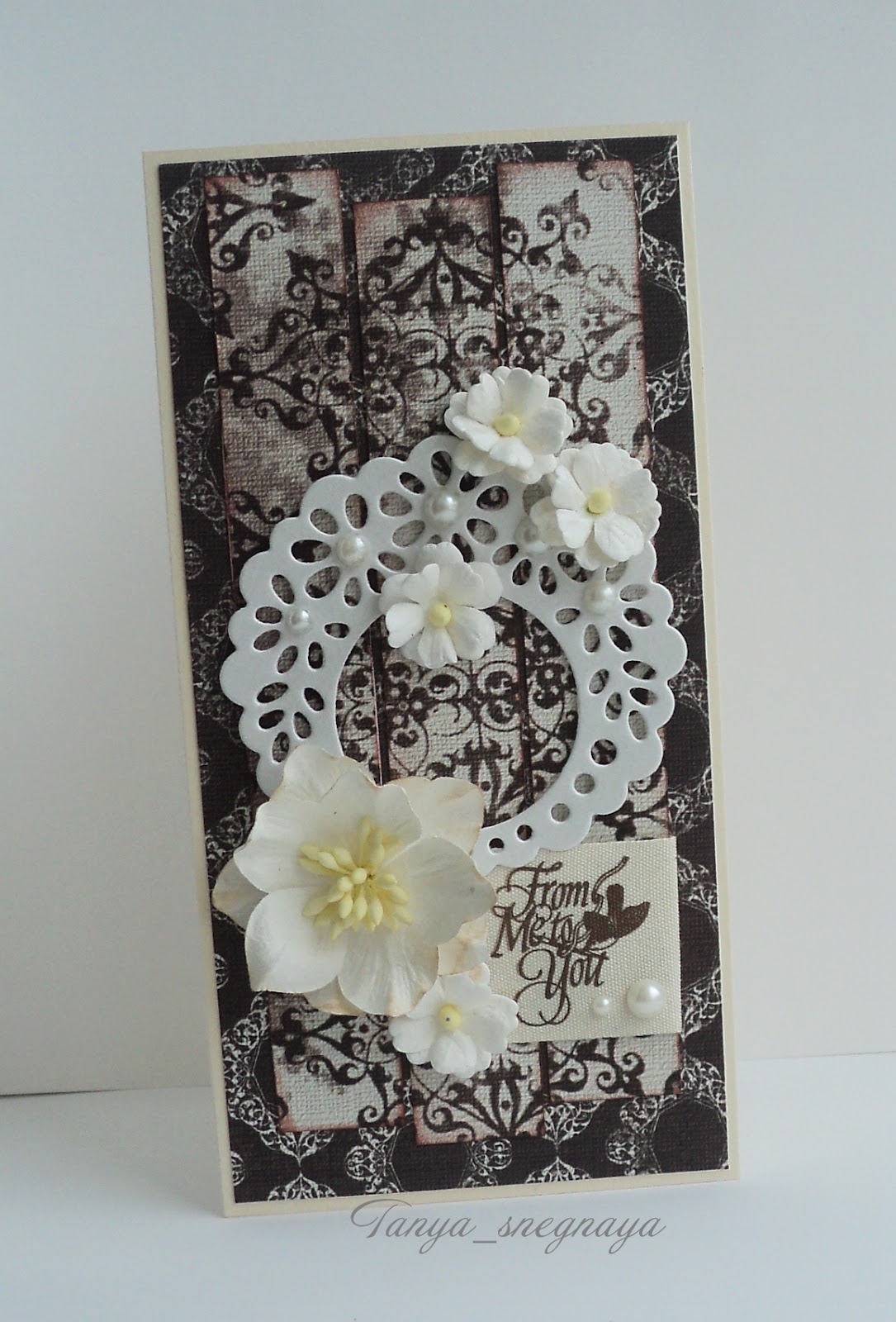 польская бумага Chocolatcaffe, хлопковая лента, вырубной элемент приподнят на вспененный скотч, клеевые полубусины, цветы.